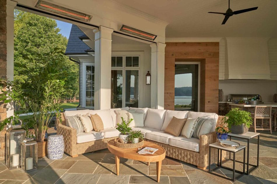 Patio heaters are often integrated into larger outdoor living designs, providing supplemental heat alongside fireplaces, fire pits, or outdoor kitchens.